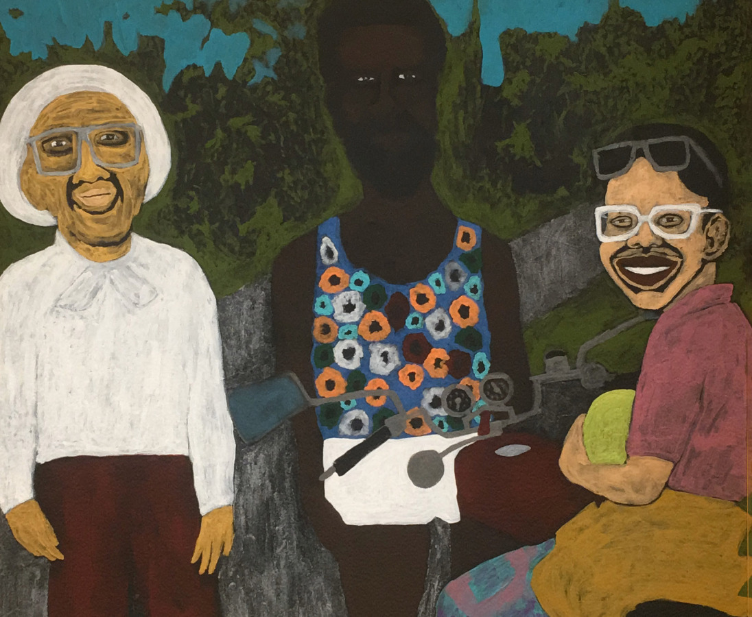 Primarily working at modest scale, Kalmplex creates portraits mostly of people he considers to be African Royalty: family members reflecting his Jamaican and Ghanaian heritage; friends and colleagues; self-portraits, and well-known figures and celebrities he admires. Beginning with photographic sources, or sometimes from memory, he renders his figures by unconventionally starting with their eyes, emphasizing the essence or internal spirit of each subject. Larger works depicting gatherings in parks, on streets, or in group settings are often composed from multiple sources, resulting in fictionalized narratives. The pictures occasionally include inspirational texts, phrases or quotes.